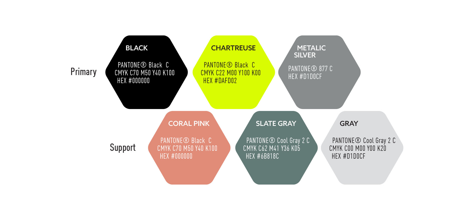 • Color Palette: Primary and supporting color system, including metallics, to convey energy and modernity.